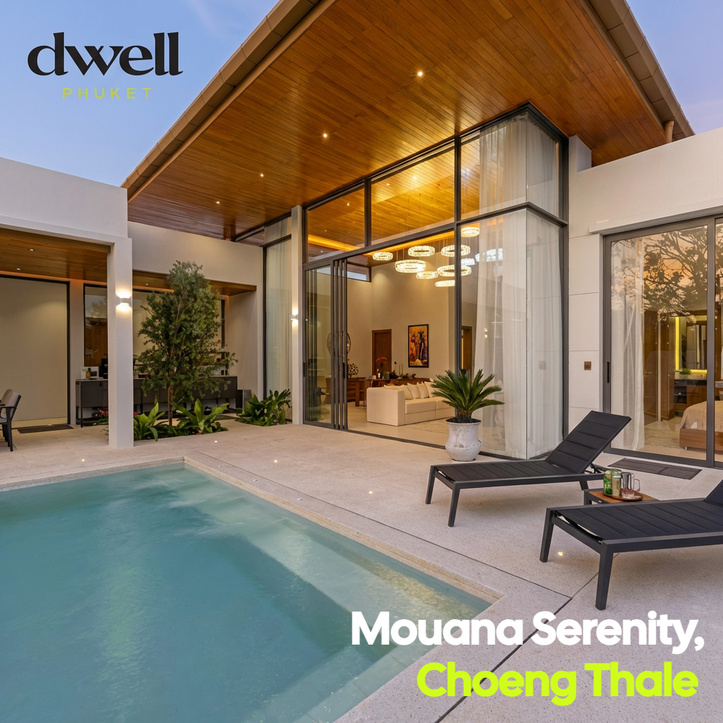 Dwell Phuket is proud to present a recently completed masterpiece in the heart of Choeng Thale. This brand-new 3-bedroom private pool villa at Mouana Serenity offers an expansive 388 sq m built-up area on a generous 525 sq m plot. Designed for those who prioritize a seamless indoor-outdoor lifestyle, this residence stands out as offering some of the finest outdoor living spaces currently available in the Phuket rental market.